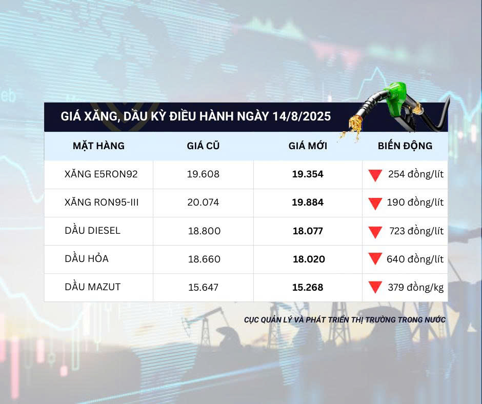 Trong kỳ điều hành ngày 14/8, giá xăng dầu đồng loạt hạ nhiệt. Dầu Diesel giảm mạnh nhất với 723 đồng/lít, kế đến là dầu hỏa giảm 640 đồng/lít và dầu madut giảm 379 đồng/kg. Giá xăng cũng giảm, với mức 254 đồng/lít đối với E5RON 92 và 190 đồng/lít với RON 95-III.